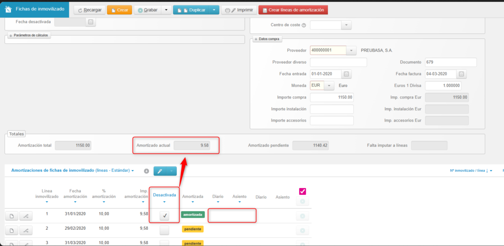 Cuando se registra un inmovilizado que ya presenta una parte previamente amortizada —y que no debe reflejarse contablemente en el sistema—, puede marcarse la opción “desactivada” en la línea de amortización. Al hacerlo, la línea se considera amortizada, pero sin generar el correspondiente asiento contable.