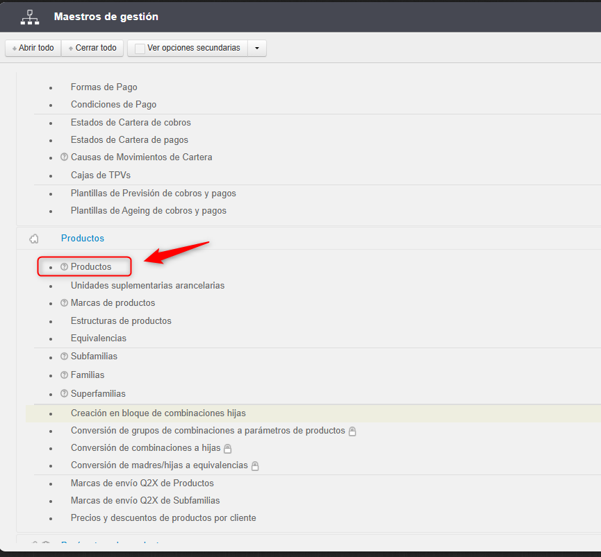 Accedemos al módulo de «Maestros de Gestión -> Productos -> Productos.«