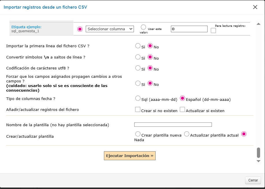 Por último, indicamos si queremos actualizar los registros existentes y/o crear nuevos registros y hacemos clic en «Ejecutar la importación».