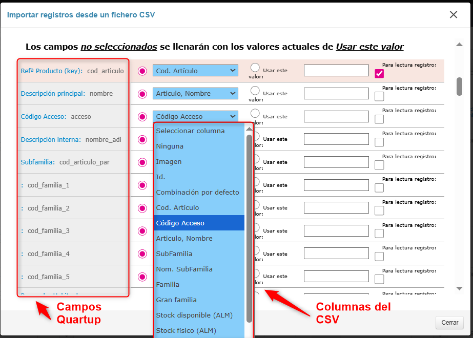 Como en todas las importaciones, tenemos que asociar los campos de la tabla de producto de Quartup con los campos que tenemos en el archivo CSV.