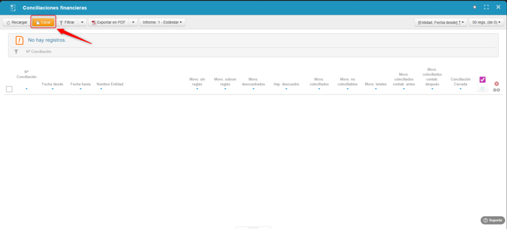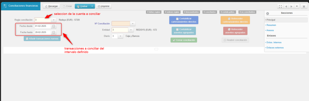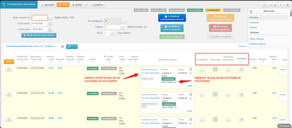 Una vez grabada la conciliación, el programa analizará cada movimiento del extracto bancario aplicando, una por una, todas las reglas de conciliación definidas para la cuenta correspondiente. Con ello, conciliará automáticamente o propondrá la conciliación/contabilización tanto de las carteras vivas registradas en el sistema como de los asientos contables directos que no se gestionan mediante carteras, como los traspasos entre cuentas o las comisiones bancarias.