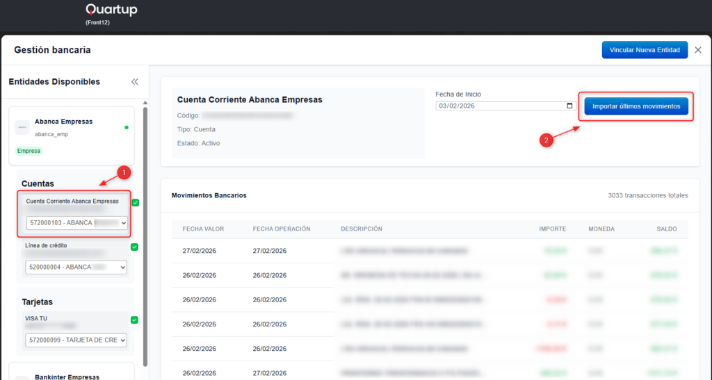Para ello, primero debes seleccionar el banco haciendo clic sobre la entidad y, a continuación, sobre la cuenta correspondiente.